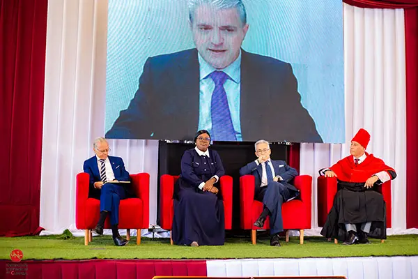 En su intervención virtual, Dr. Santos Gracia Villar recordó el origen y la evolución del proyecto universitario, subrayando que la creación de la Universidade Internacional do Cuanza (UNIC) responde a una visión estratégica iniciada en 2018 con el objetivo de ampliar el acceso a la educación superior de calidad en la región central de Angola. En su mensaje, destacó que el proyecto comenzó a materializarse en 2020 con la construcción del campus universitario en la ciudad de Cuito, un proceso que simboliza la transformación del territorio y el compromiso con el desarrollo social. El Dr. Gracia Villar enfatizó que el terreno donde hoy se levanta la universidad había sido anteriormente un campo minado, por lo que su recuperación y reconversión en un espacio dedicado al conocimiento, la formación académica y la cooperación internacional representa un poderoso símbolo de paz, progreso y esperanza para las nuevas generaciones del país. Asimismo, señaló que la universidad aspira a consolidarse como un referente regional en educación superior, investigación e innovación, contribuyendo activamente al crecimiento económico y al fortalecimiento del capital humano en Angola.